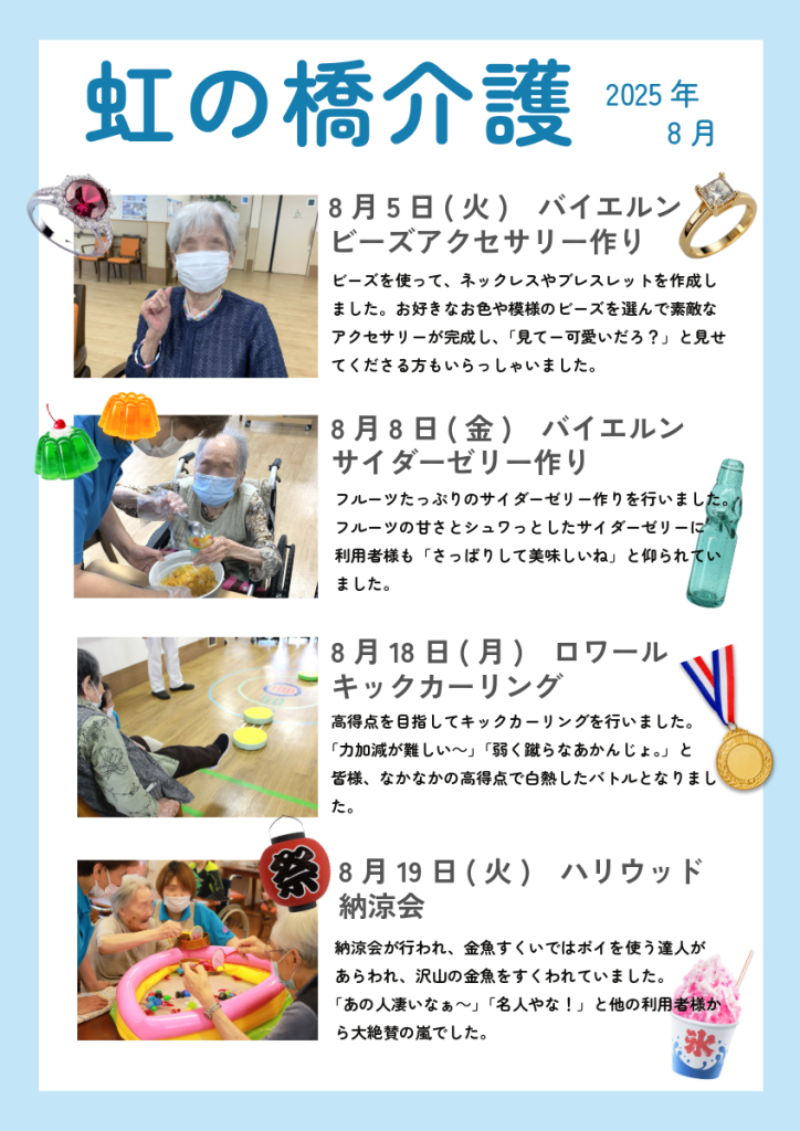 8月もデイサービスやデイケアでは、様々なレクリエーションが行われ、夏の暑さも吹き飛ばすような利用者様の笑顔に溢れた日々を過ごすことができました。😊🎶